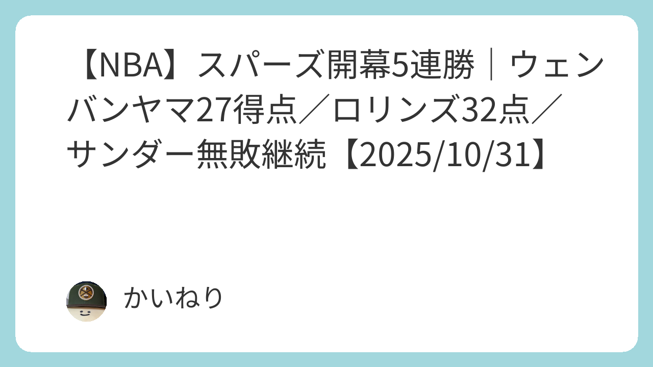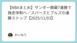 【NBAまとめ】スパーズ開幕5連勝|ウェンバンヤマ27得点/ロリンズ32点/サンダー無敗継続【2025/10/31】