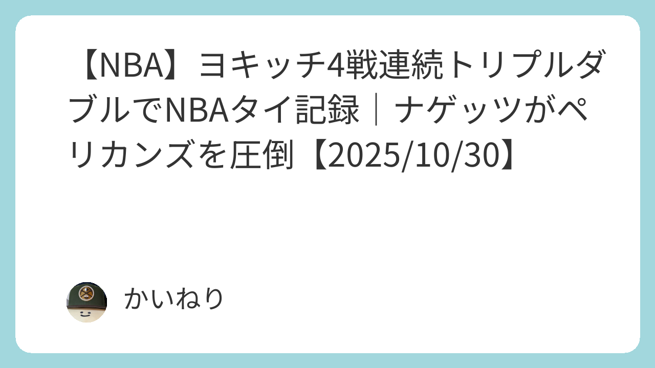 【NBA】ヨキッチ4戦連続トリプルダブルでNBAタイ記録|ナゲッツがペリカンズを圧倒【2025/10/30】