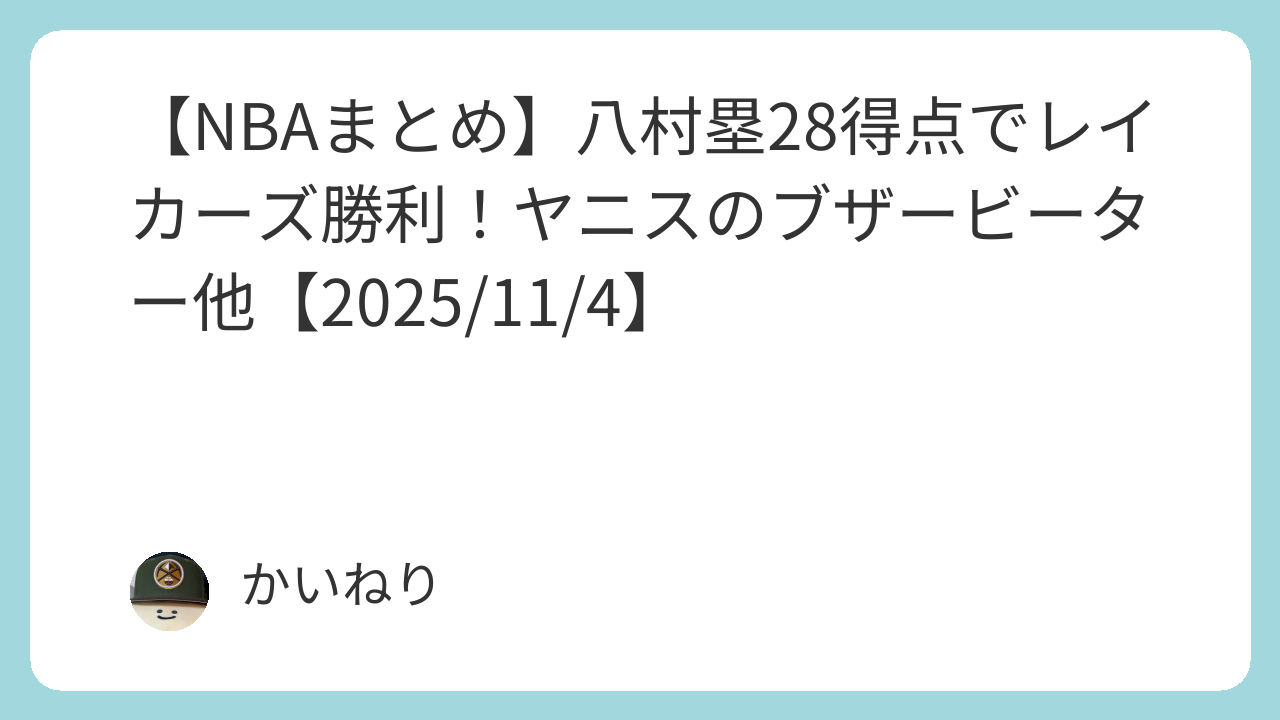 2025年11月4日(日本時間)のNBAは、八村塁が28得点の大活躍でレイカーズを勝利に導いたほか、バックスのヤニス・アデトクンボが劇的なブザービーターを沈め、ニコラ・ヨキッチが34得点・14アシストでナゲッツを勝利に導くなど、スターたちが存在感を放った一日となった。