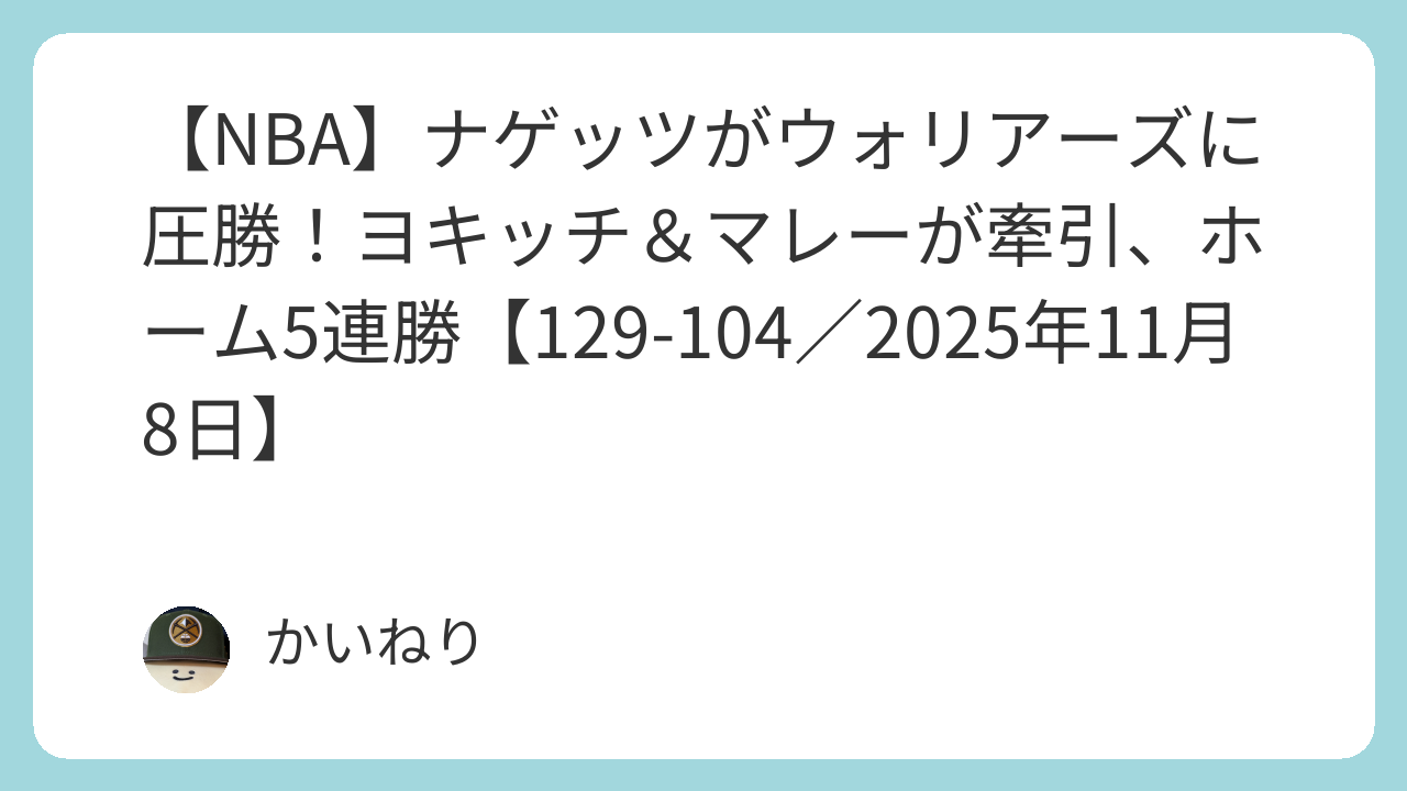 試合は第2Q途中、ヨキッチ退場中にウォリアーズが11-0のランで迫ったが、マレーの連続スリーとバランチュナスの一発で流れを取り戻し、前半を66-49で折り返した。以降はナゲッツが一気に突き放し、第3Q終了時点で99-77。第4Qは完全に主力を温存して勝利を決めた。