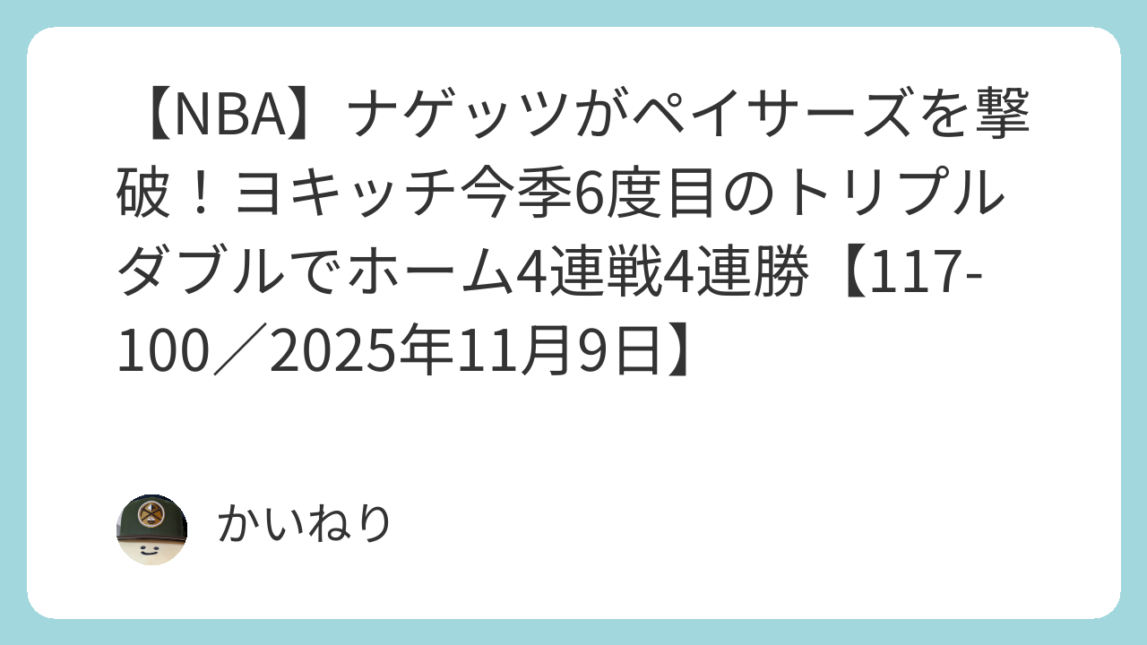 ヨキッチにとっては今季9試合で6度目のトリプルダブルとなり、ナゲッツは4連勝で4戦全勝のホームスタンドを締めくくった。
