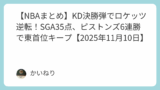 ナゲッツは前半から3Pが好調で、試合を通して22/43(51.2%)を記録。CBとAGを欠く中でも攻撃力を維持し、終盤はマレーの3本やTHJのクラッチショットで逃げ切った。