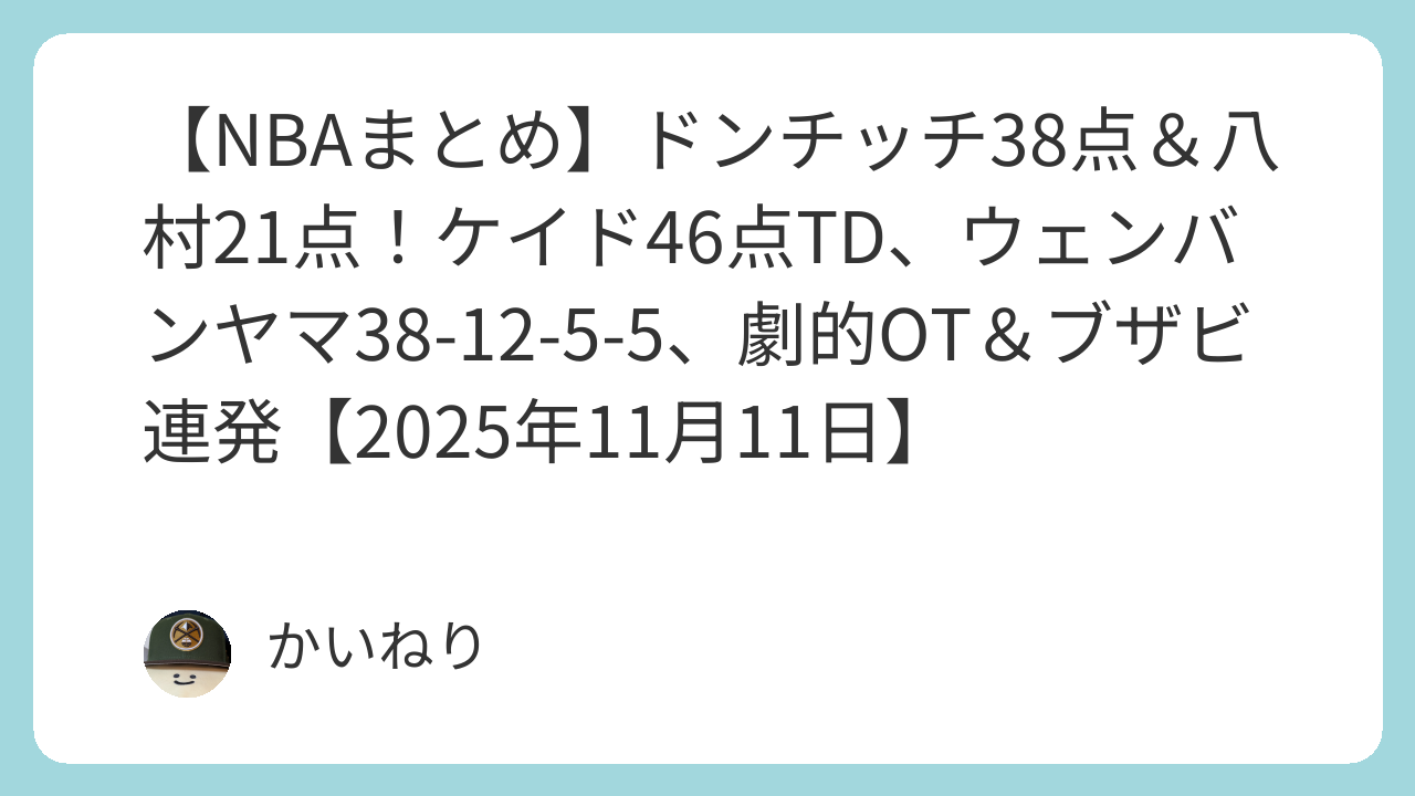 【NBAまとめ】ドンチッチ38点&八村21点!ケイド46点TD、ウェンバンヤマ38-12-5-5、劇的OT&ブザビ連発【2025年11月11日】