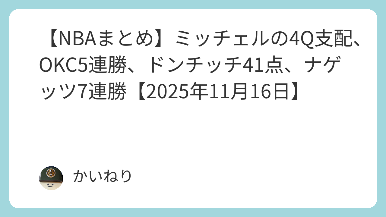 【NBAまとめ】ミッチェルの4Q支配、OKC5連勝、ドンチッチ41点、ナゲッツ7連勝【2025年11月16日】