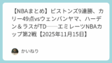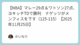 ナゲッツはスターター2人を欠いたうえに、ヨキッチがあまりよくなかった(3QでTD定期)があっさりと勝利。詳細は別記事で。