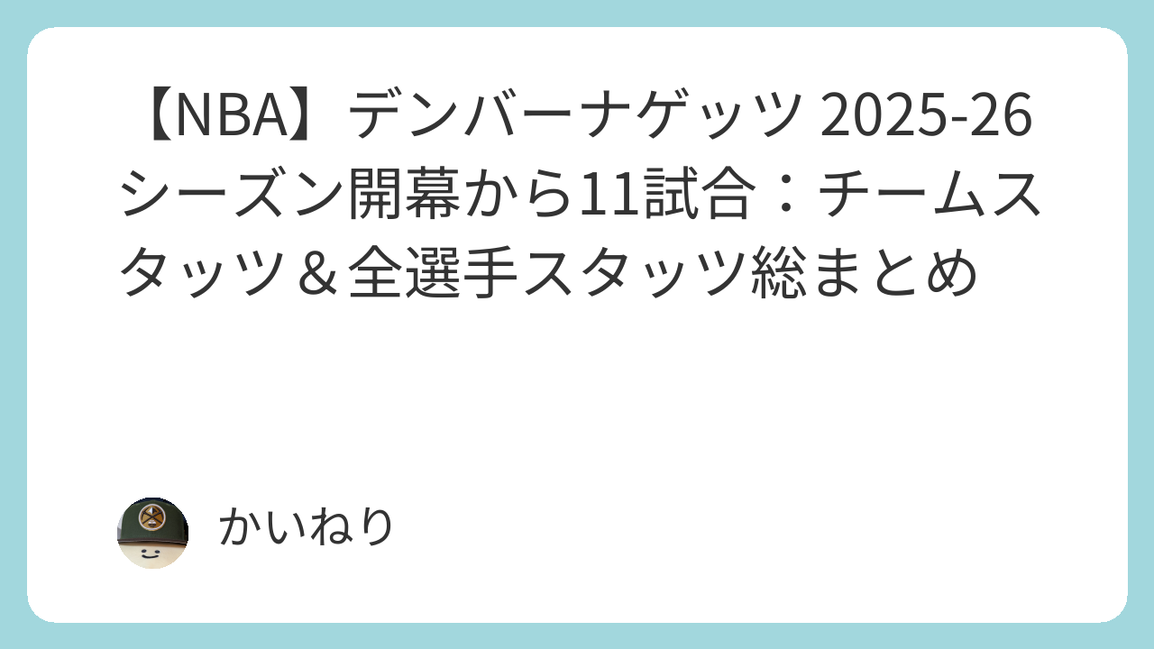 2025-26シーズン開幕から11試合を終えたデンバーナゲッツのチームスタッツと、ロスター全選手の主要成績をまとめたデータ総覧です。勝率は9勝2敗(.818)、攻守効率はリーグトップクラスで、ヨキッチを中心に今季も優勝候補級のスタートになっています。このタイミングでまとめた理由は特にありません。