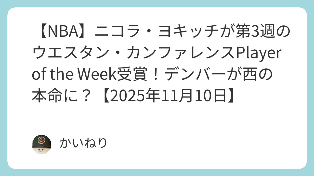 NBAは、2025年11月3日から9日までの試合での活躍により、デンバーナゲッツのニコラ・ヨキッチがウエスタン・カンファレンス Player of the Weekに選出されたと発表。